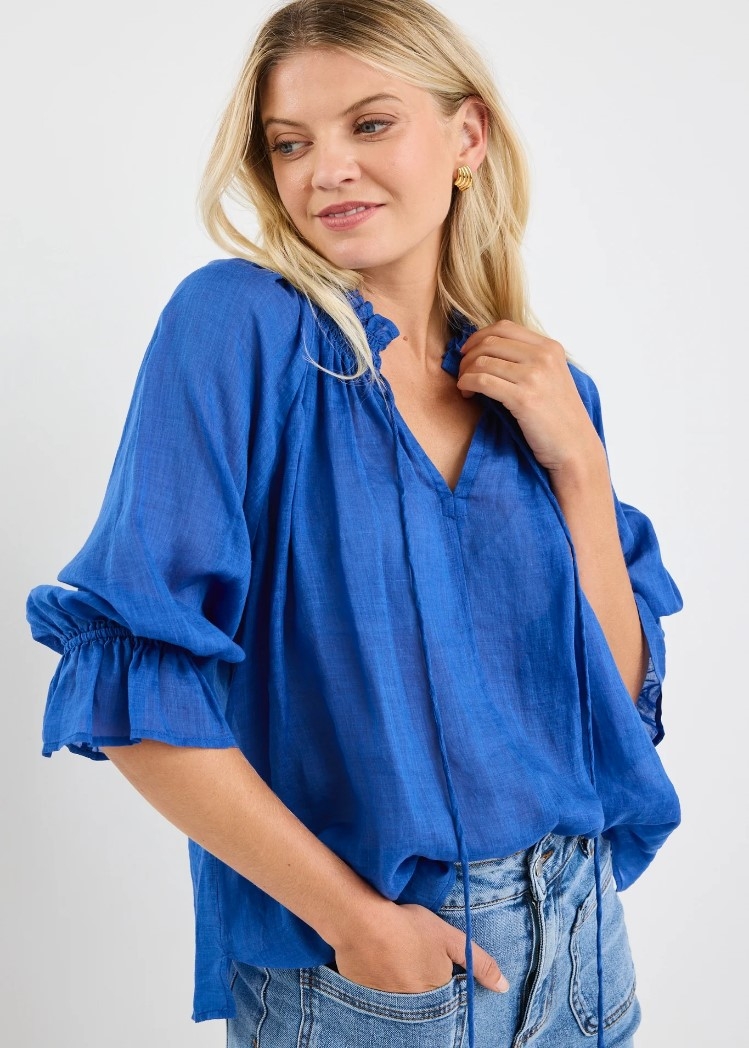 Relaxed yet refined, the Radiant blue blouse brings a fresh and effortless feel to every day. Designed with soft puff sleeves, a flattering v-neckline and gentle shirring, this oversized silhouette floats gracefully with every move. Crafted from a luxurious linen-lyocell blend using natural fibres, it feels breathable, soft and perfect for cross-seasonal layering. Pair it with denim for easy high-low dressing or elevate with tailored pants for a chic twist.