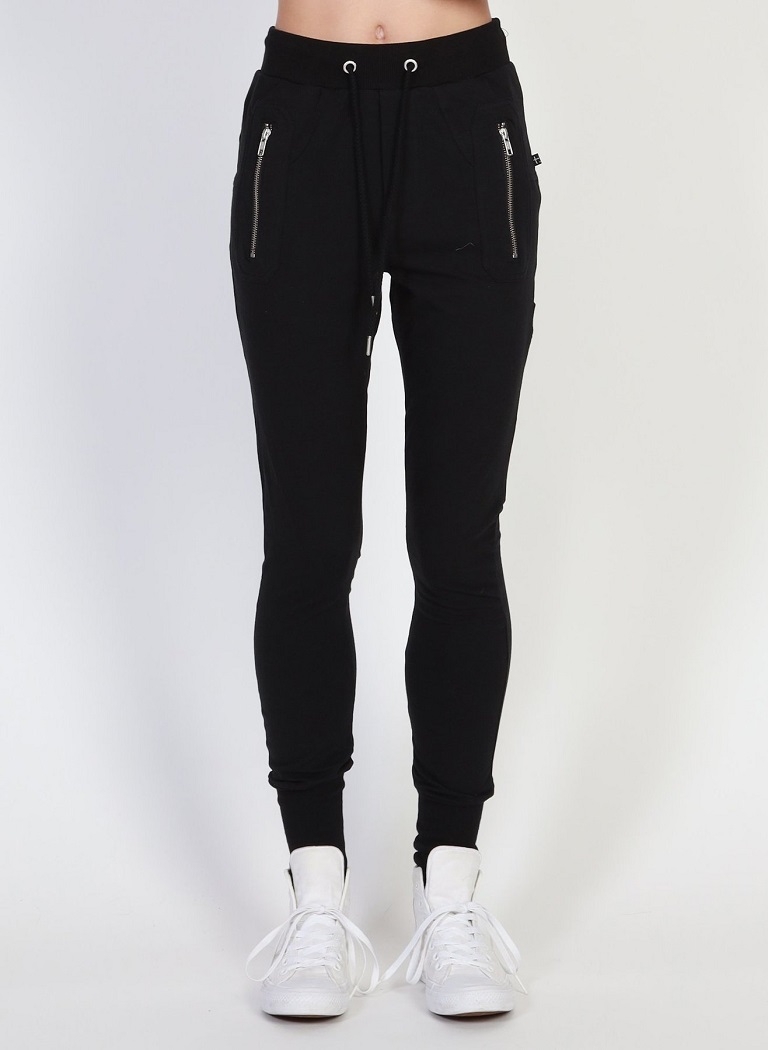 Our much-loved slim-leg trackies in classic black and gold. The Escape Trackie features gold metal zip detailing upfront and a patch pocket on the left leg.