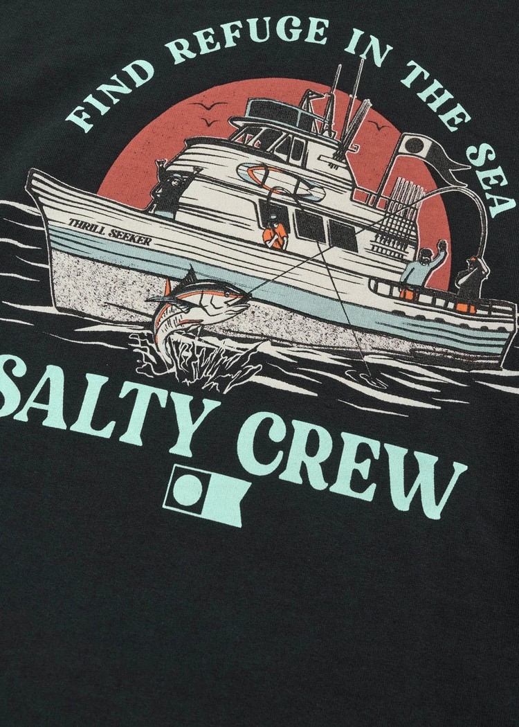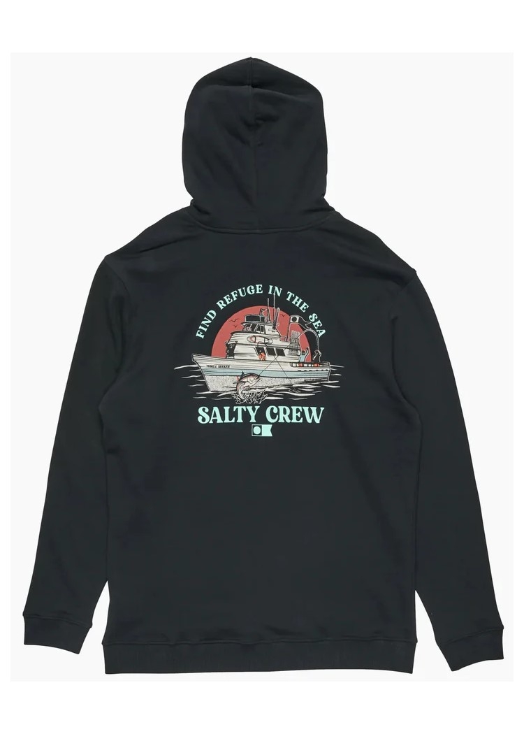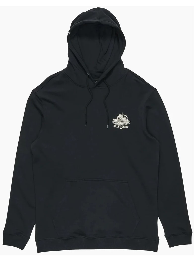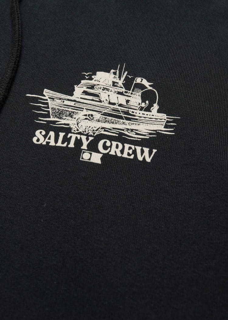 The Day Charter Boys Fleece Hood in Black is a pullover hoodie made from mid-weight cotton/polyester brushed fleece, 280gsm in weight. It features a two-piece hood with an encased drawcord, rib knit cuffs and hem, and a self-fabric kangaroo pocket. Finished with screen printed graphics on the front, back, and sleeves.