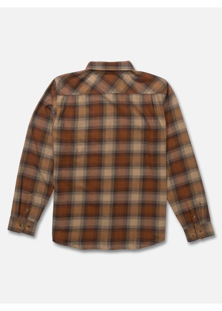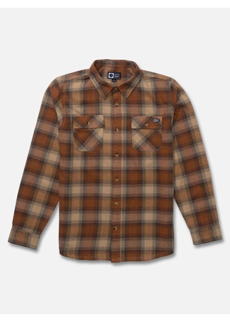Daybreak Flannel is Friar Brown is a yarn-dyed check shirt featuring twin chest pockets with pocket flaps and button closures. It is finished with Salty Crew branded buttons at the center front and a Salty Crew woven label at the left chest.