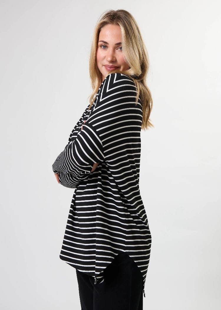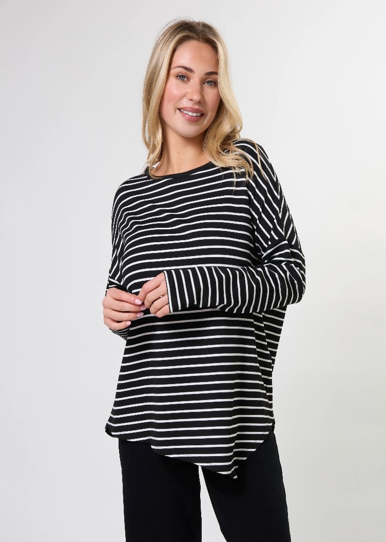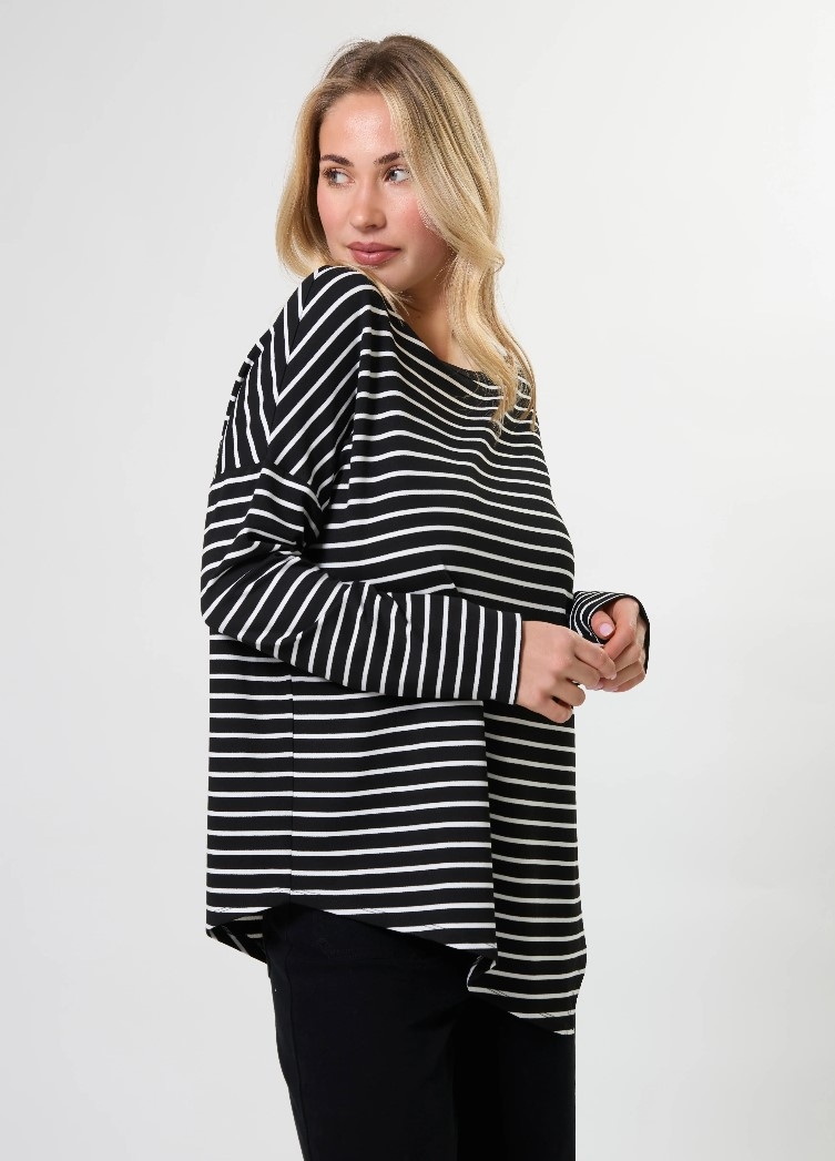 Relaxed fit jersey knit striped crew neck with dropped shoulder, fitted lower sleeve and asymmetric hemline.