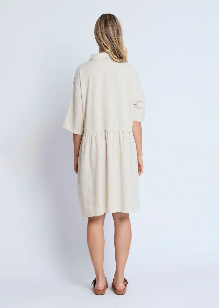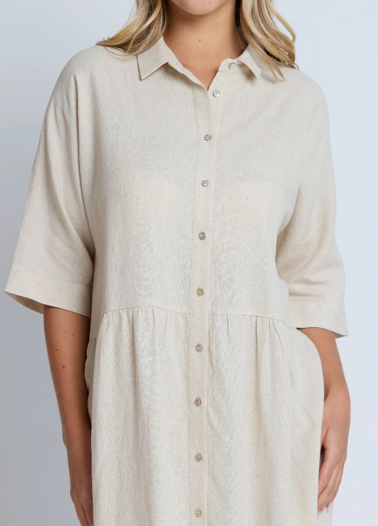 Dolman sleeve relaxed fit dress with button front placket, shirt collar and waist seam with gathering