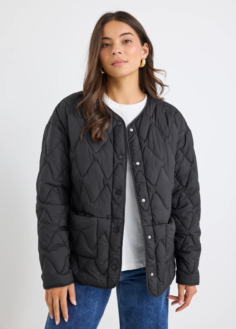 Meet the Frankly Black Boxy Snap Front Collarless Quilted Puffer Jacket, your go-to layer for effortless style and comfort. Designed with a relaxed, boxy silhouette and soft quilted texture, this piece feels lightweight yet cosy, making it a versatile layer you will reach for again and again.