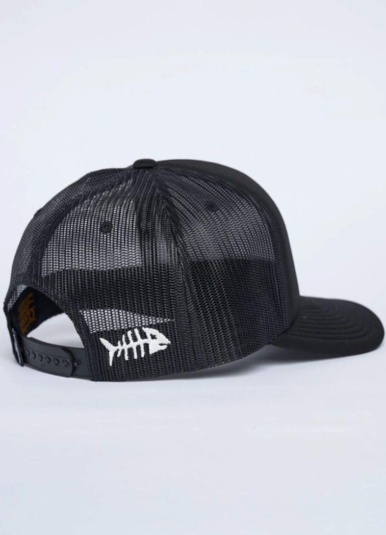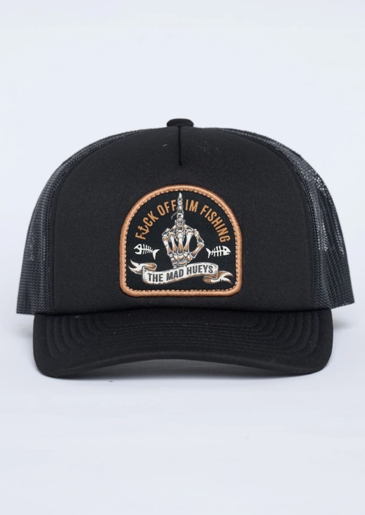 Keep the message clear and the vibe strong with the FK OFF FISH | FOAM TRUCKER in Black. Featuring the same bold “Fk Off, I’m Fishing” slogan, rude finger, fish skeletons, and hibiscus flowers as the tee, this black foam trucker is perfect for those who want to keep distractions off the water and good times rolling. Rugged, comfortable, and full of Hueys attitude—just how we like it.