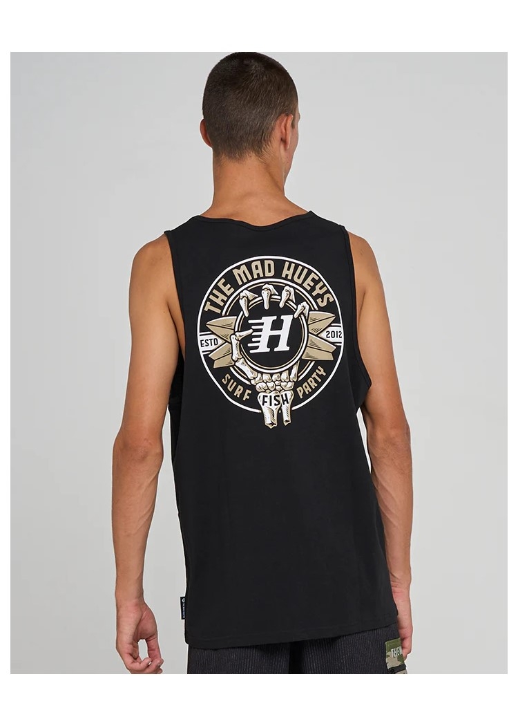 Stay cool and stylish with the Surf Hueys Tank in black. Featuring a big FK off H emblem, surfboards, and a skeleton hand, this tank is made for those who want to rep the Hueys lifestyle while keeping it laid-back. Whether you're hitting the surf or just enjoying a sunny day, this tank lets you live the dream.
